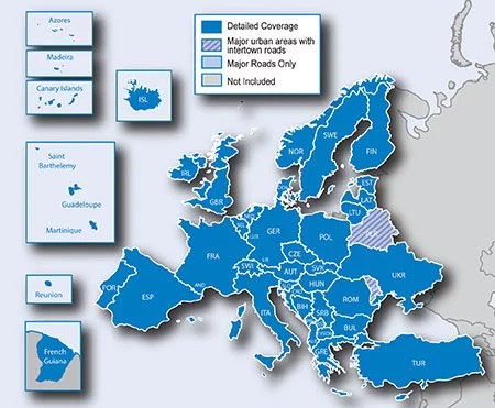 • Includes navigational features, such as turn restrictions, roundabout guidance, speed categories and more.